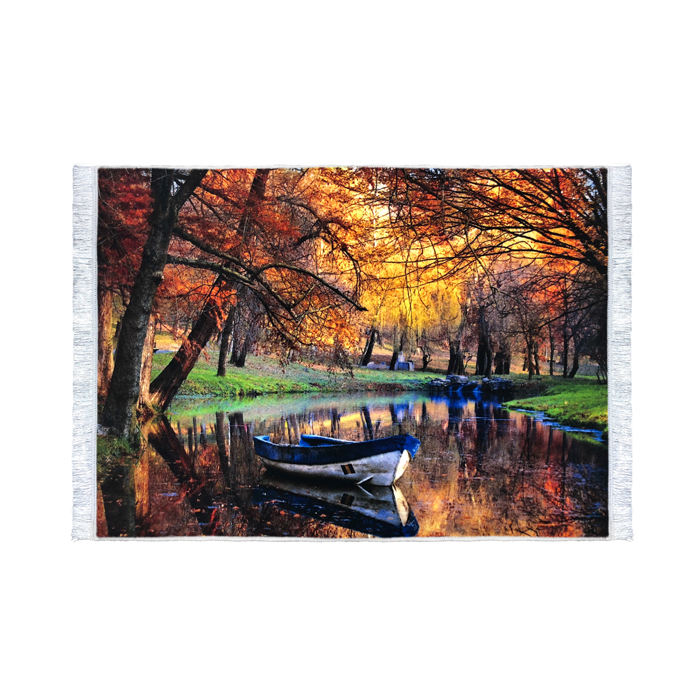 تابلو فرش طرح منظره پاییزی و قایق یکی از نمونه های چاپ سطحی یا سابلیمنشن میباشد