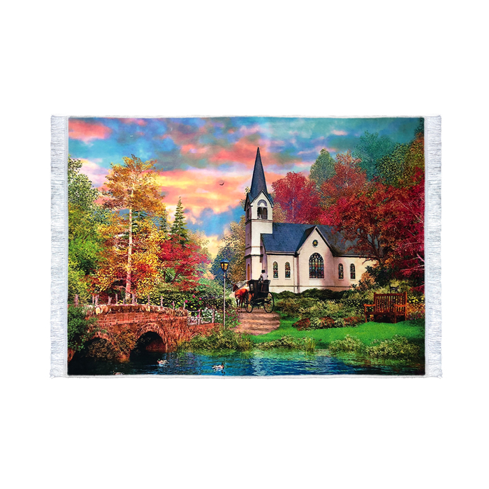 تابلو فرش طرح منظره کلبه یکی از نمونه های چاپ سطحی یا سابلیمنشن میباشد