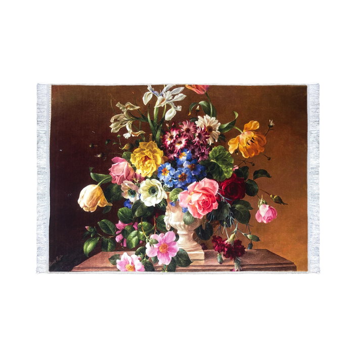 تابلو فرش طرح گل و گلدان کد 183 یکی از نمونه های چاپ سطحی یا سابلیمنشن میباشد که در سایز های 50*35، 70*50، 100*70، 150*100 قابل چاپ میباشد