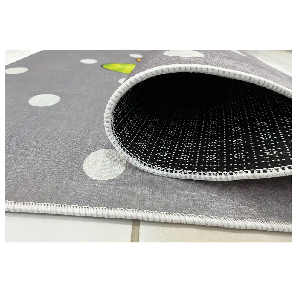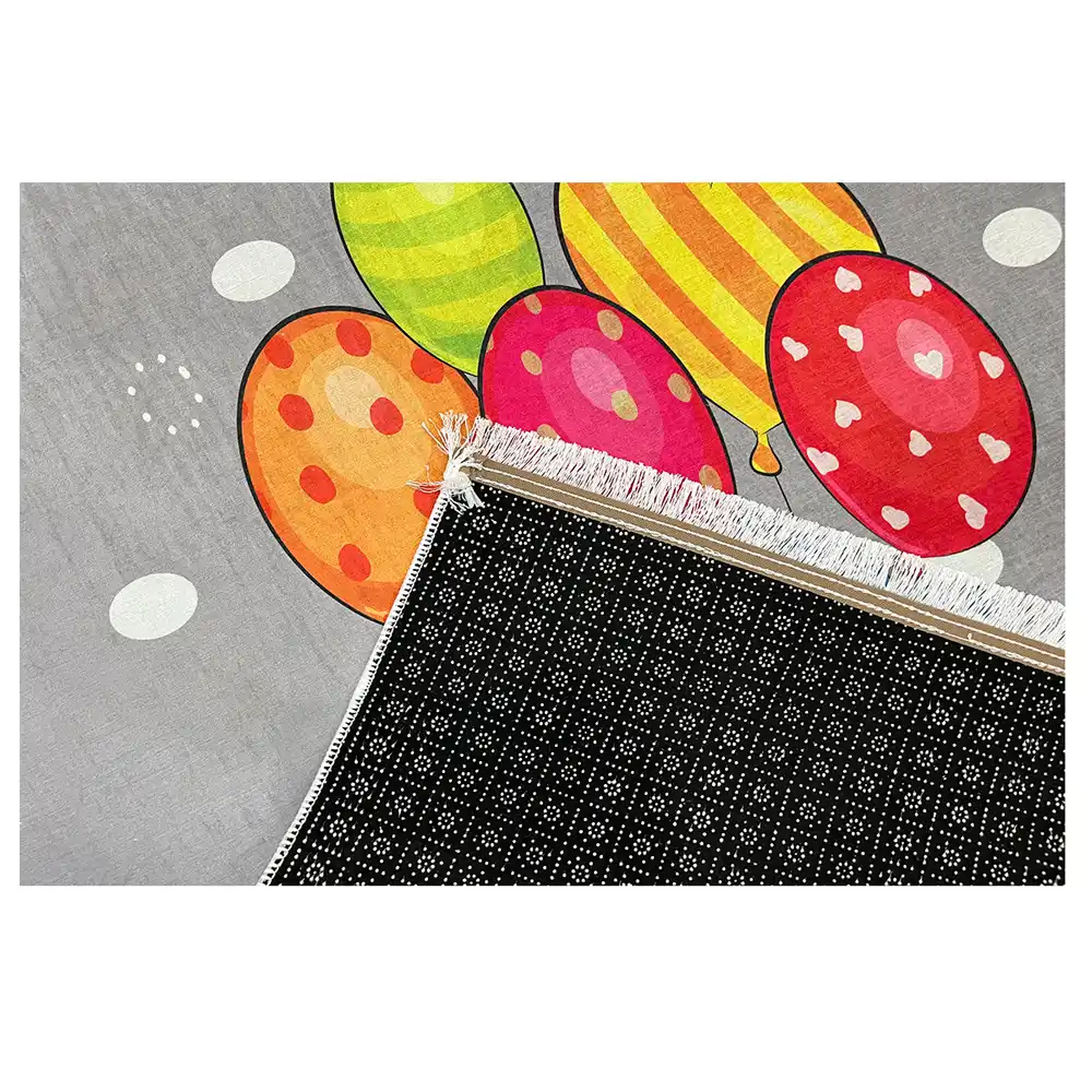 فرشینه کودک خرس و بادکنک کد R201 به صورت اختصاصی در سایز یک در یکونیم متری به سفارش مشتری انجام شده. این فرشینه از سه لایه تشکیل میشود: رویه آن جنس مخمل است، لایه میانی آن نمد فشرده شده و  زیره آن چرم ضد لغزش است. حتی روی سرامیک و پارکت هم سر نمی خورد.