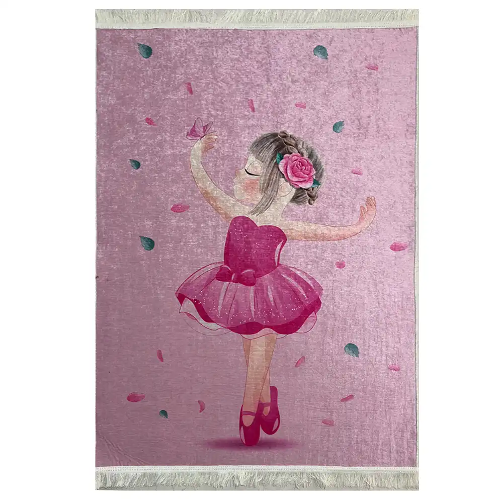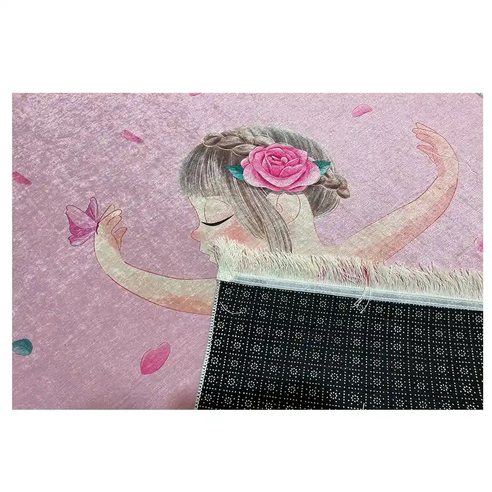 فرشینه کودک دختر گل به سر کد R216 به صورت اختصاصی در سایز یک در یکونیم متری به سفارش مشتری انجام شده. این فرشینه از سه لایه تشکیل میشود: رویه آن جنس مخمل است، لایه میانی آن نمد فشرده شده و زیره آن چرم ضد لغزش است. حتی روی سرامیک و پارکت هم سر نمی خورد.
