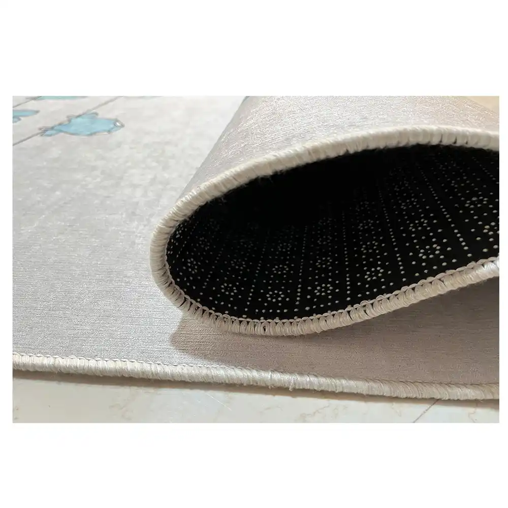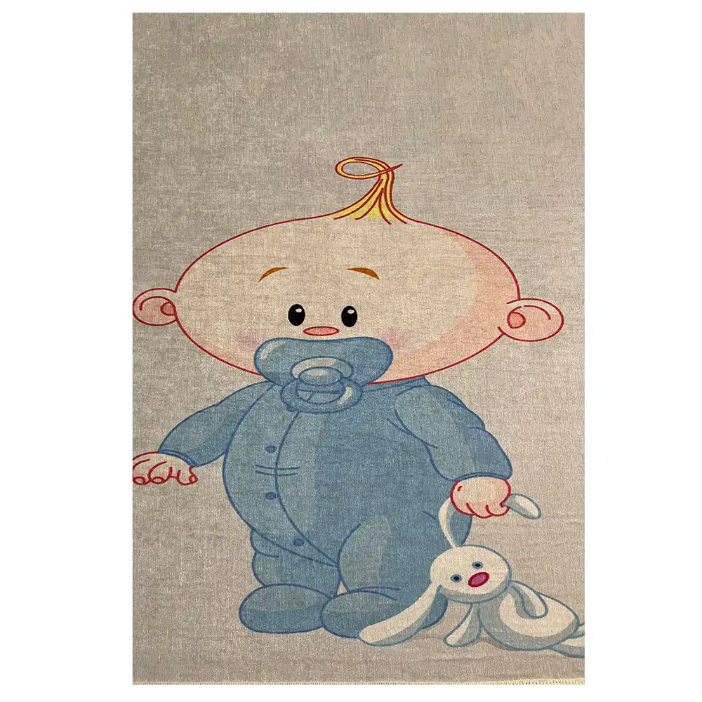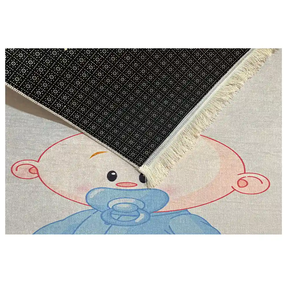 فرشینه کودک نوزاد و خرگوش کد R213 به صورت اختصاصی در سایز یک در یکونیم متری به سفارش مشتری انجام شده. این فرشینه از سه لایه تشکیل میشود: رویه آن جنس مخمل است، لایه میانی آن نمد فشرده شده و  زیره آن چرم ضد لغزش است. حتی روی سرامیک و پارکت هم سر نمی خورد.