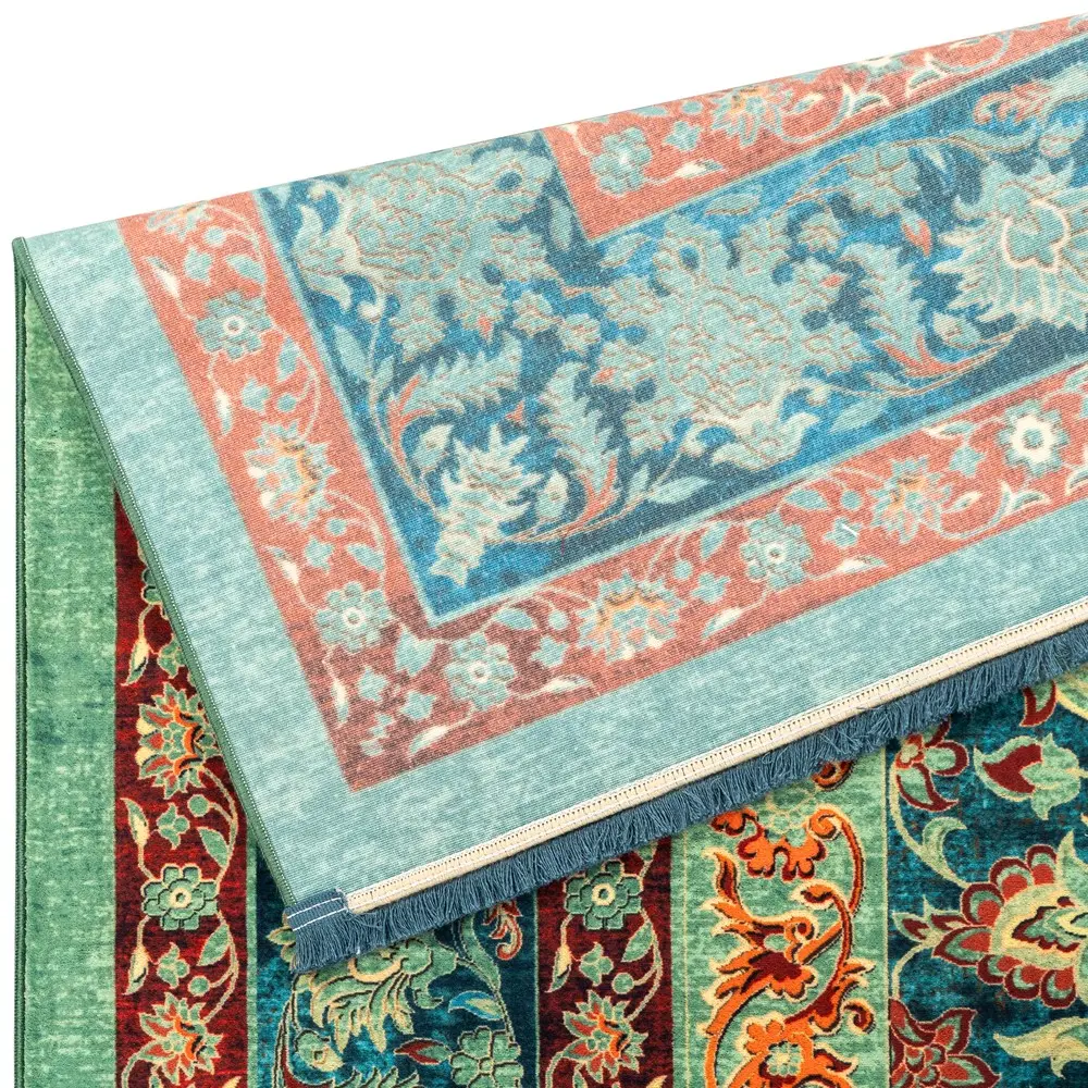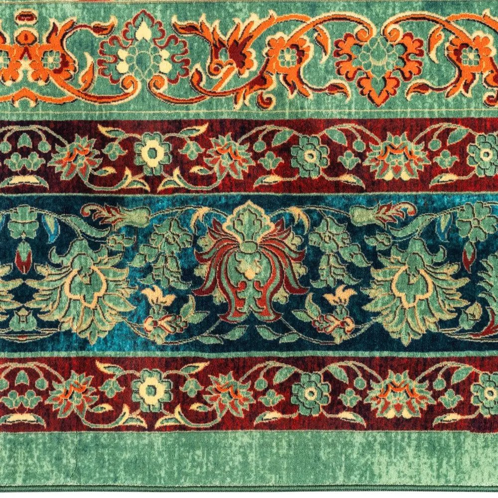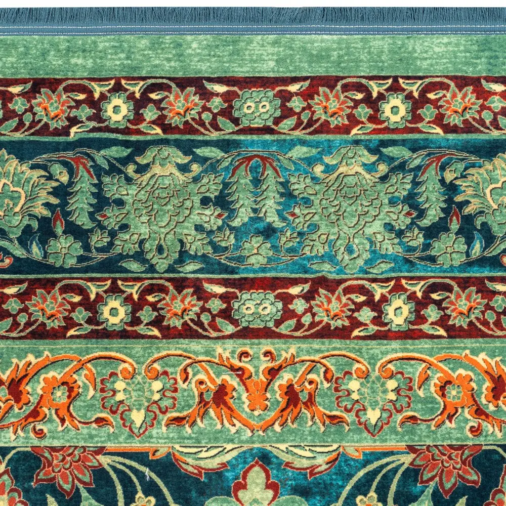 فرش محتشم طرح هلنا کد 25TT0050 سبز، معادل یک فرش دستباف ۷۷ رج است و همین موضوع باعث ظاهر بسیار ظریف و ریزبافت آن میشود.
