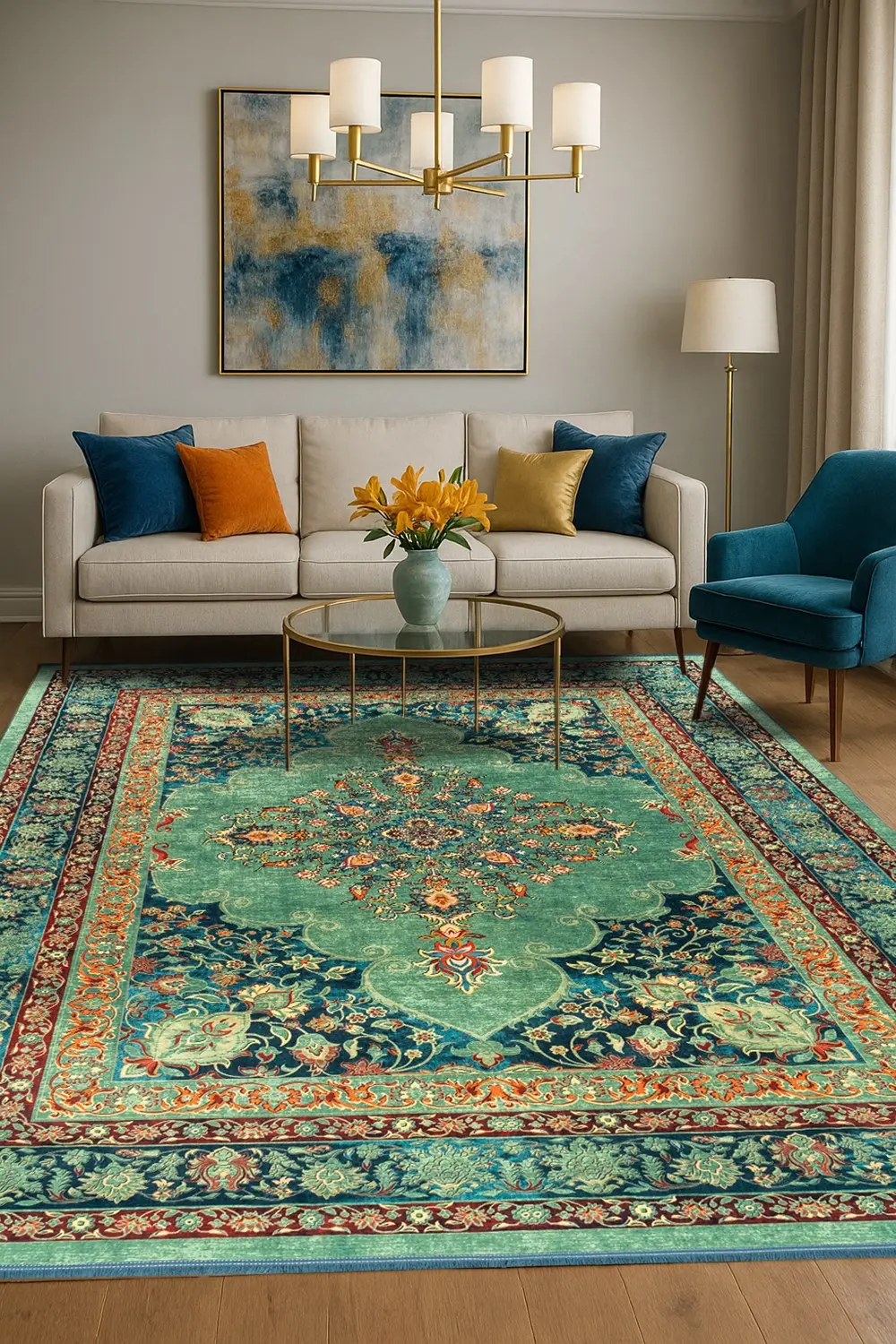 برای جذابتر شدن فضای خانه، بهتر است ابعاد فرش کمی کوچکتر از فضای قرارگیری انتخاب شود. این کار باعث میشود مبلمان کاملاً فرش را نپوشاند و محیط بازتر و چشمنوازتر دیده شود.