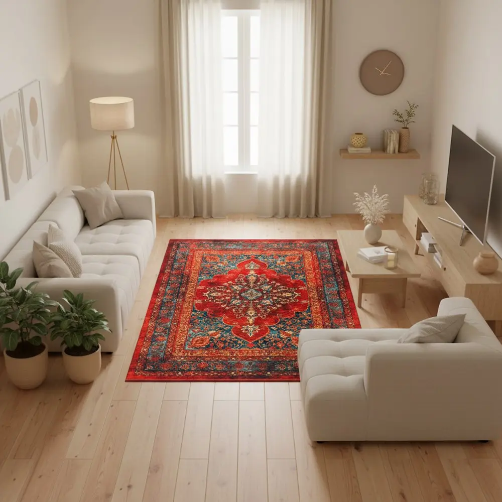 برای جذابتر شدن فضای خانه، بهتر است ابعاد فرش کمی کوچکتر از فضای قرارگیری انتخاب شود. این کار باعث میشود مبلمان کاملاً فرش را نپوشاند و محیط بازتر و چشمنوازتر دیده شود.