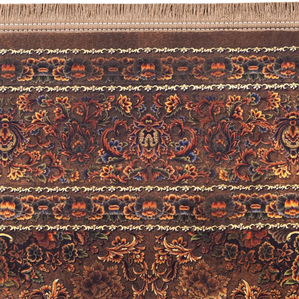 فرش محتشم طرح هلنا کد25NH0020 قهوه ای، معادل یک فرش دستباف ۷۷ رج است و همین موضوع باعث ظاهر بسیار ظریف و ریزبافت آن میشود.