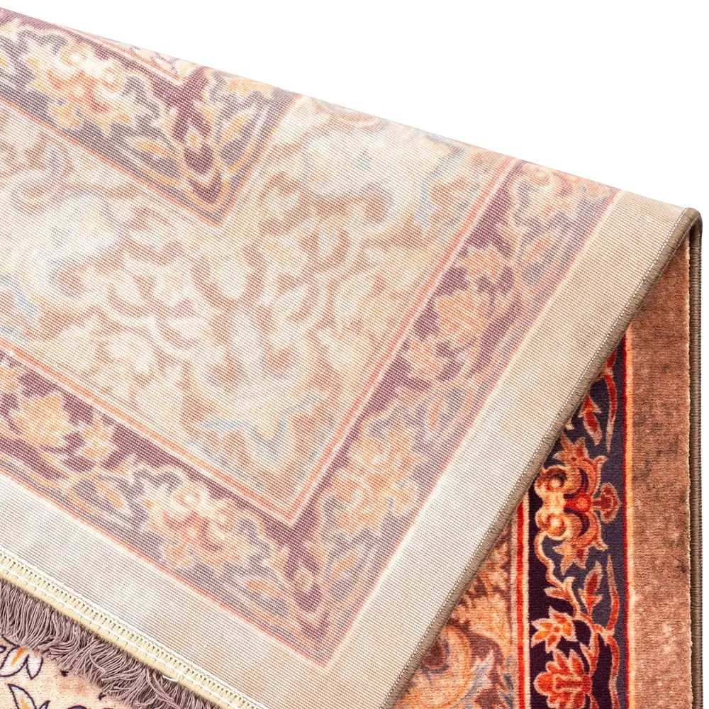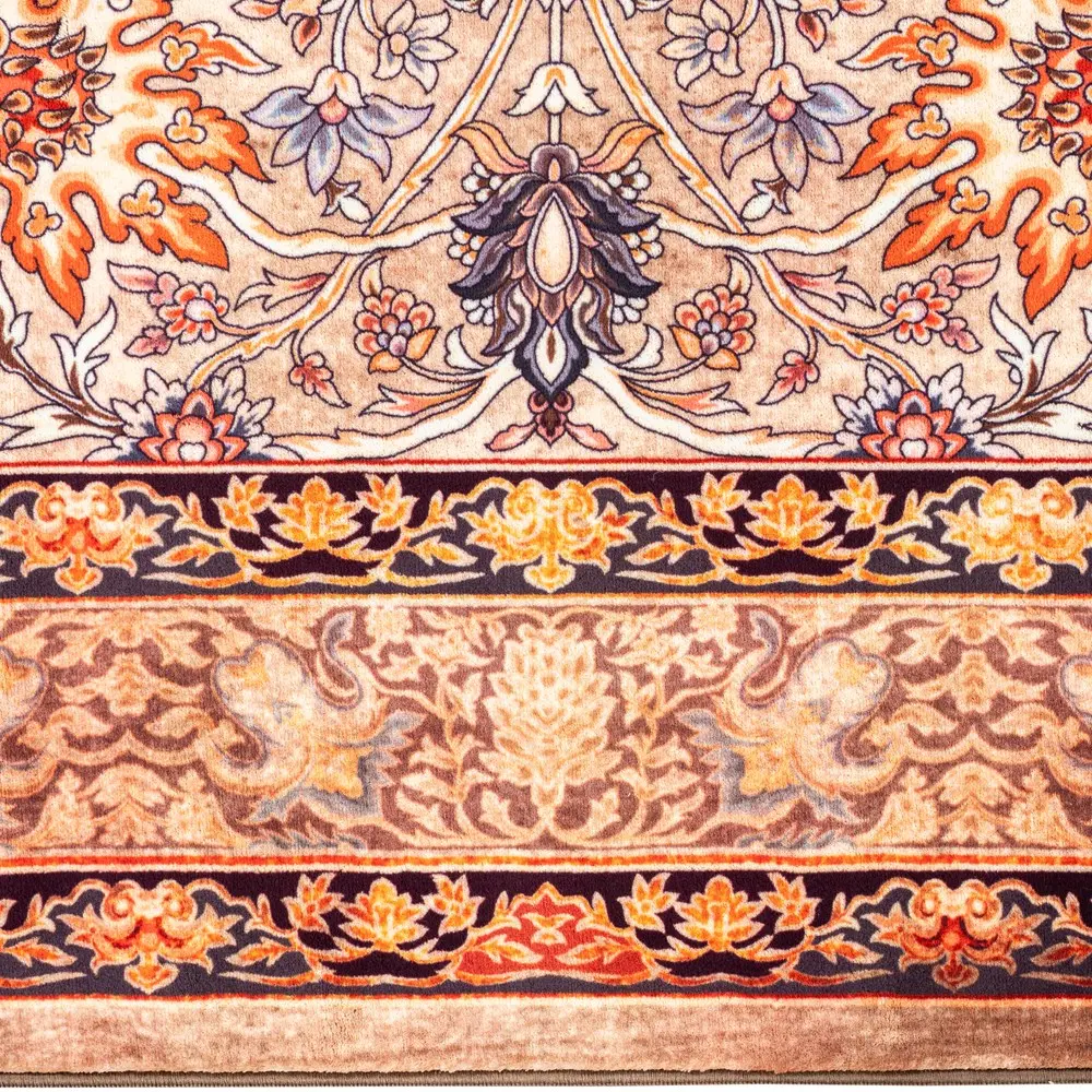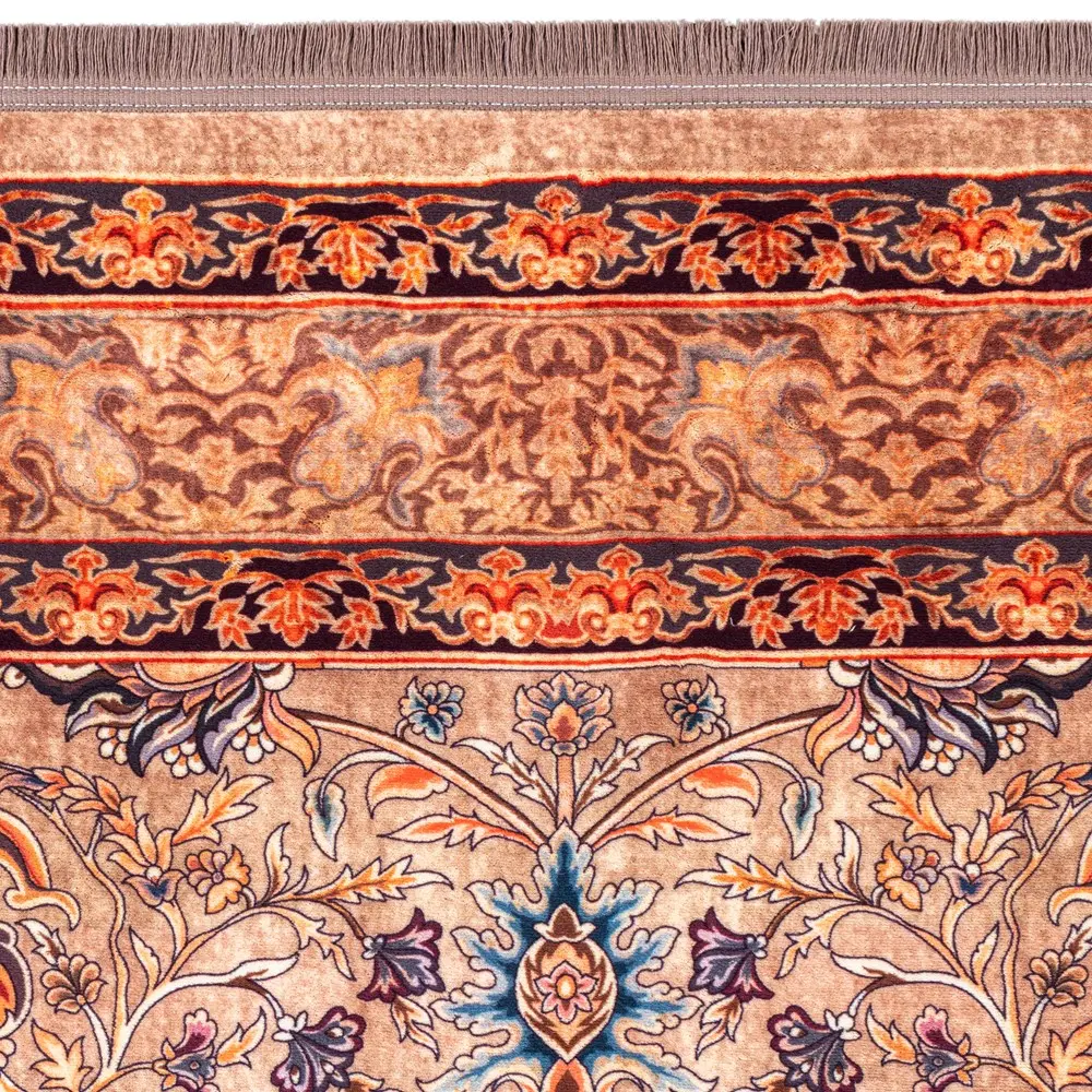 فرش محتشم طرح هلنا کد25NH0050 بادامی، معادل یک فرش دستباف ۷۷ رج است و همین موضوع باعث ظاهر بسیار ظریف و ریزبافت آن میشود.