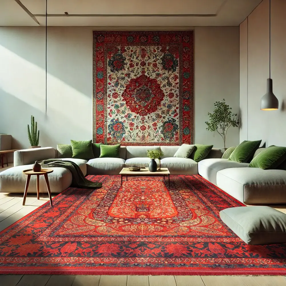 برای جذابتر شدن فضای خانه، بهتر است ابعاد فرش کمی کوچکتر از فضای قرارگیری انتخاب شود. این کار باعث میشود مبلمان کاملاً فرش را نپوشاند و محیط بازتر و چشمنوازتر دیده شود.