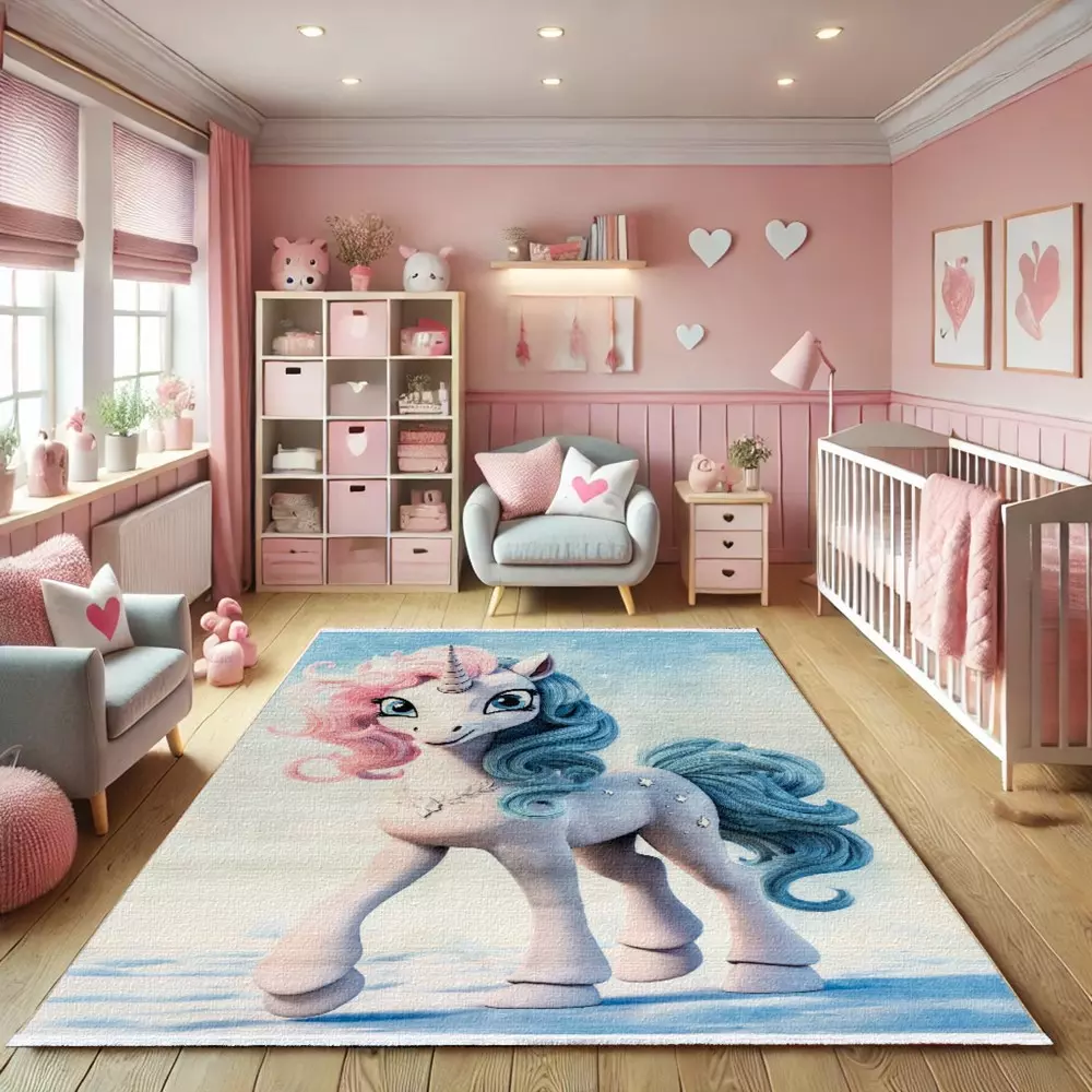 فرش کودک اسب تکشاخ کد 25KK0050 مشخص است این طرح فقط مناسب اتاق کودک میباشد و برای دیگر قسمت های منزل مناسب نمیباشد.