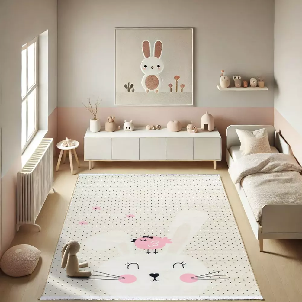 فرش کودک خرگوش و پرنده کد 25KM0160 مشخص است این طرح فقط مناسب اتاق کودک میباشد و برای دیگر قسمت های منزل مناسب نمیباشد.