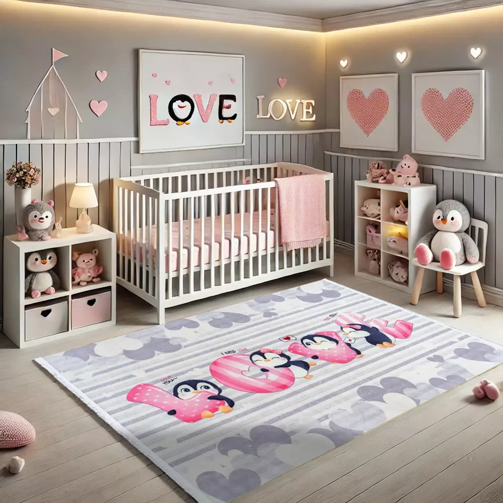 فرش کودک پنگوئن های عاشق کد 25KM0140 مشخص است این طرح فقط مناسب اتاق کودک میباشد و برای دیگر قسمت های منزل مناسب نمیباشد.