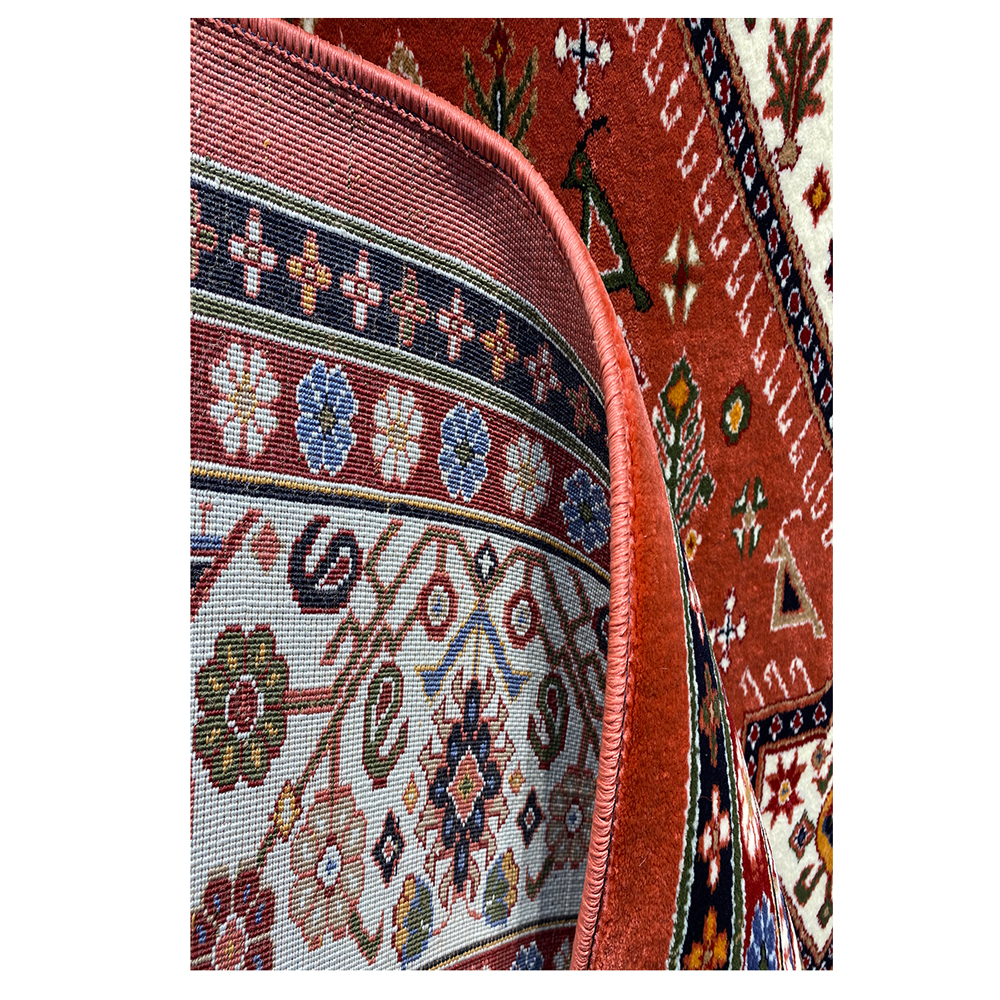 رنگ قرمز اناری و طراحی سبک سنتی فرش های بلوچی ماشینی را به نمونه های مشابه دستبافت نزدیک کرده است. اصالت فرش های بلوچی به عشایر بلوچ که در مرز های ایران، افغانستان و پاکستان زندگی میکنند برمیگردد. این عشایر در فرش ها همیشه از رنگ های زنده و گرم استفاده میکنند و از نظر طراحی الگوهایی شاد و ساده دارند.